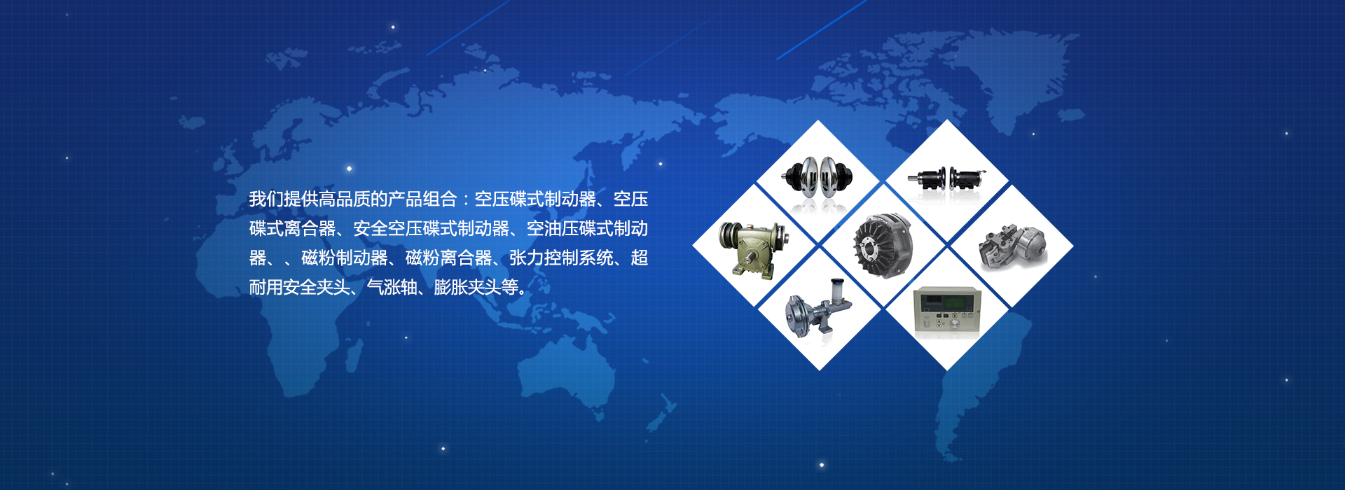 我们提供高品质的产品组合:空压碟式制动器、空压碟式离合器、安全空压碟式制动器、空油压碟式制动器、、磁粉制动器、磁粉离合器、张力控制系统、超耐用安全夹头、气涨轴、膨胀夹头等。